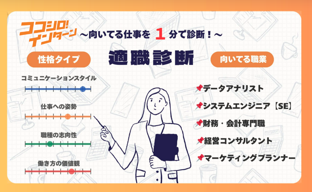あなたの性格タイプや、向いている業界・仕事を即チェック。診断後すぐにインターン求人も見つかる!