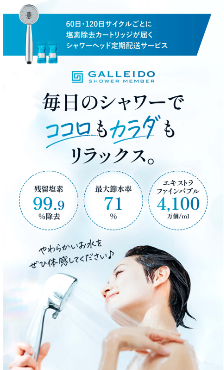 ガレイドシャワーメンバーとは、塩素除去やエキストラファインバブルなどの高機能なシャワーヘッドを使用できるサブスクリプション(定期購入制)のサービス。