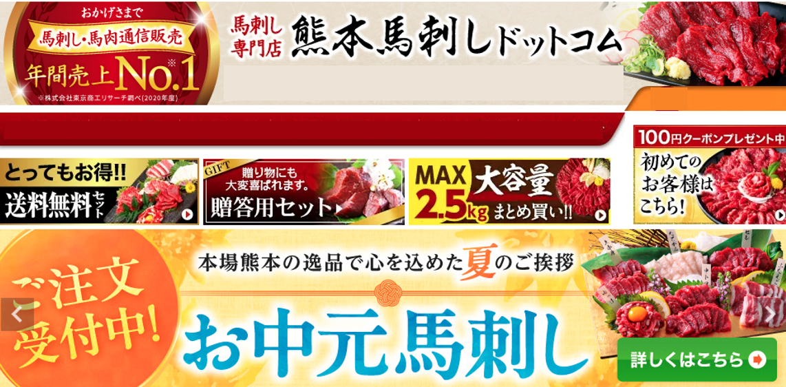 株式会社 利他フーズが運営する【熊本馬刺しドットコム】は、本場熊本から鮮度抜群の馬刺しを全国へお届けする通販専門店です。販売数100万食を誇り、全国5,000店の飲食店でプロにも愛用されています。